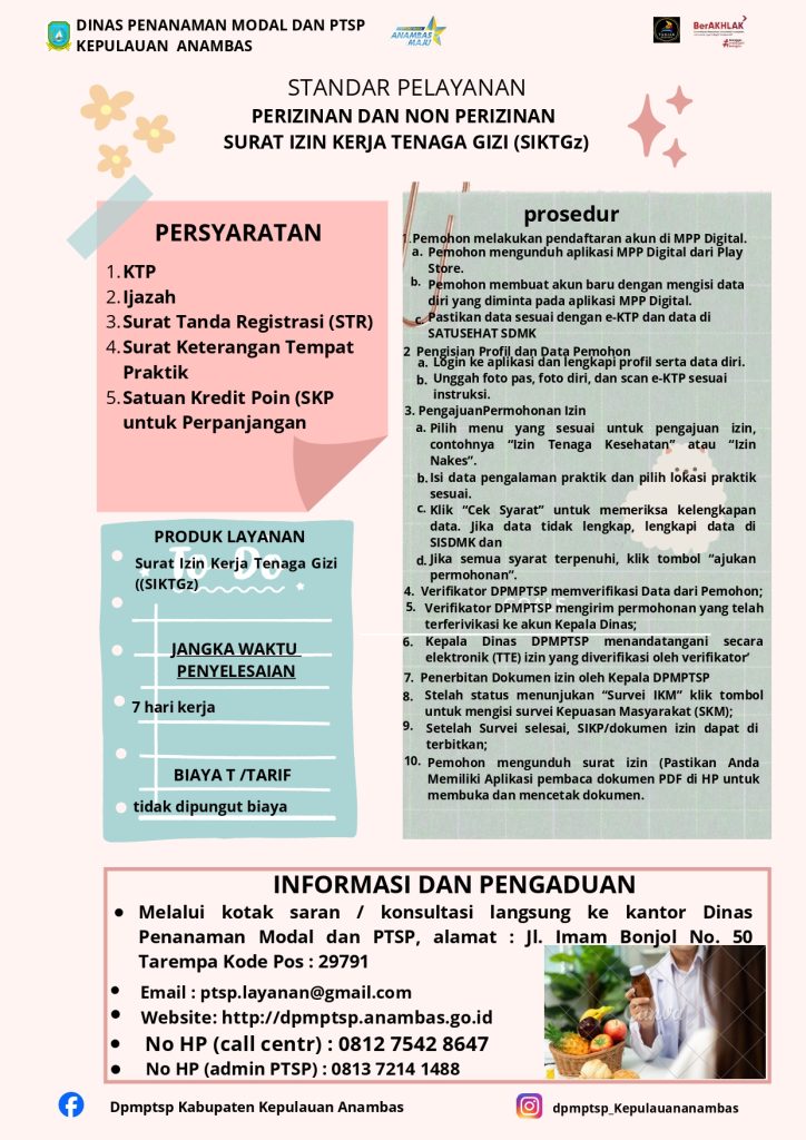 STANDAR PELAYANAN PERIZINAN DAN NON PERIZINAN SURAT IZIN KERJA TENAGA GIZI | |