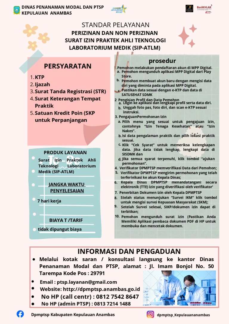 STANDAR PELAYANAN PERIZINAN DAN NON PERIZINAN SURAT IZIN PRAKTIK AHLI LABORATORIUM MEDIK | |