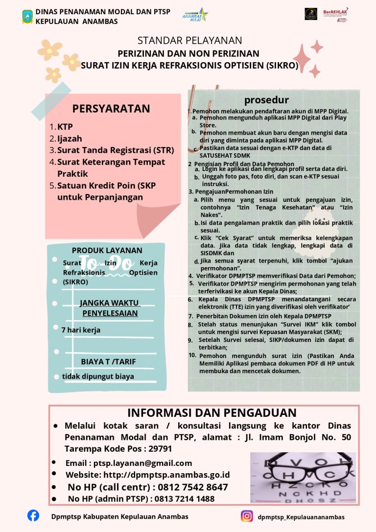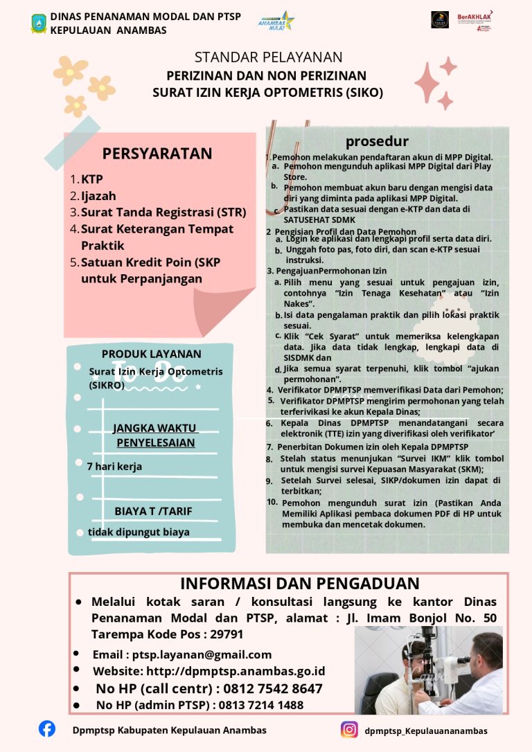STANDAR PELAYANAN PERIZINAN DAN NON PERIZINAN SURAT IZIN KERJA REFRASIONIS OPTISIEN | |