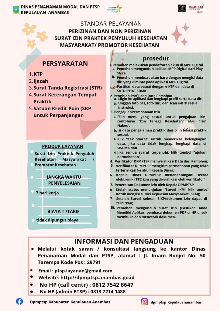 STANDAR PELAYANAN PERIZINAN DAN NON PERIZINAN SURAT IZIN PRAKTIK PENYULUH KESEHATAN MASYARAKAT/PROMOTOR KESEHATAN | |