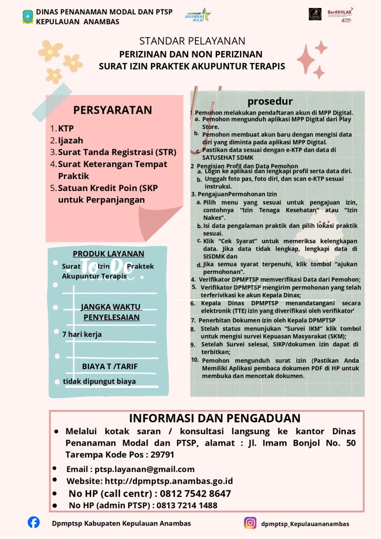 STANDAR PELAYANAN PERIZINAN DAN NON PERIZINAN SURAT IZIN PRAKTIK AKUPUNTUR TERAPIS | |